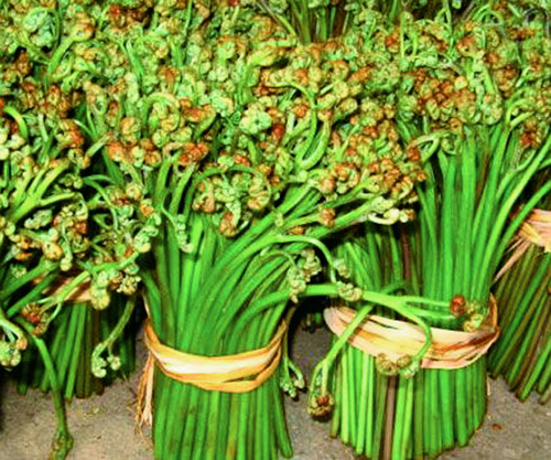 拳菜的营养成分丰富,用途广泛。春季可当蔬菜采集其嫩芽鲜食,尤与肉类搭配烹饪,口感、味道甚佳。也可采集嫩芽干制腌渍,还可加工成罐头。随着生活水平的提高,拳菜已逐渐成为各大宴席上的一道美味佳肴。拳菜的采收,以4~6月份为宜,最好每天上午9时以前采收完毕。采收部分应为20~25cm高、羽状小叶苞尚未展开(即“抱拳”时)的幼芽。采收时,应从新鲜部分以下适当的部位用手一根一根地折下,轻轻放于底部垫有青草的筐内,并在筐的最上面再盖一层青草,以防失水老化。可连续采收2~3茬。鲁山西部、西南部山区多野生拳菜,年产达2万公斤,为鲁山著名土特产。