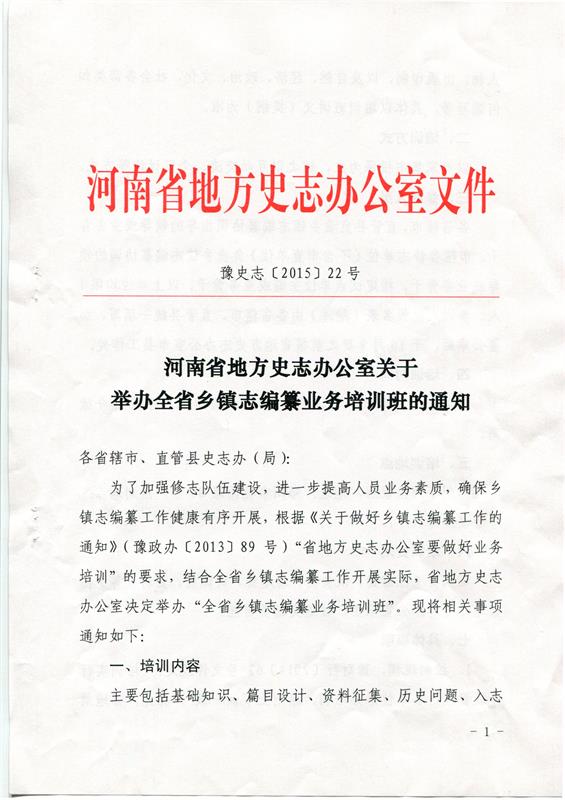 河南省地方史志办公室关于举办全省乡镇志编纂业务培训班的通知