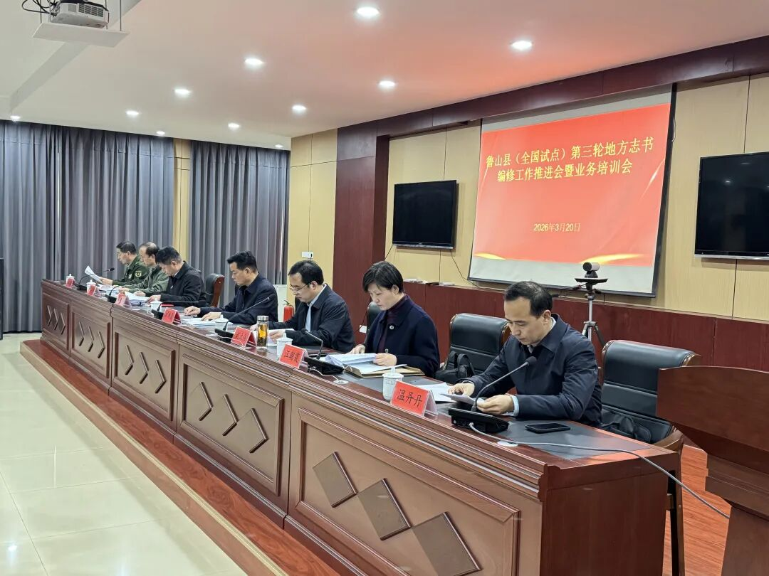 2026年3月20日上午,鲁山县(全国试点)第三轮地方志书编修工作推进会暨业务培训会在县联通公司四楼会议室隆重召开。会议深入贯彻落实国家、省、市关于三轮地方志书国家试点工作的决策部署,动员全县上下以高度的政治责任感和历史使命感,全力以赴完成好《鲁山县志(2006-2025)》编纂工作。省委党史和地方史志研究室第六研究处处长赵立伟,三级调研员、第六研究处副处长汪朝霞;市委党史和地方史志研究室主任郭铁锋、二级调研员孙洪涛;县委书记刘新彦,县委常委、县委办公室主任温丹丹,县委常委、人武部部长杨国旺等省市县领导出席会议。平顶山市各县(市、区)党史和地方史志研究室主要负责人、主管业务副职,县委各部委、县直及驻鲁各单位、各乡(镇、街道、中心)主要负责同志、牵头撰稿人,全体编辑人员参加会议。会议由温丹丹主持,杨国旺宣读《中共鲁山县委 鲁山县人民政府关于调整鲁山县地方史志(年鉴)编纂委员会成员的通知》,郭铁锋、赵立伟、刘新彦分别讲话。